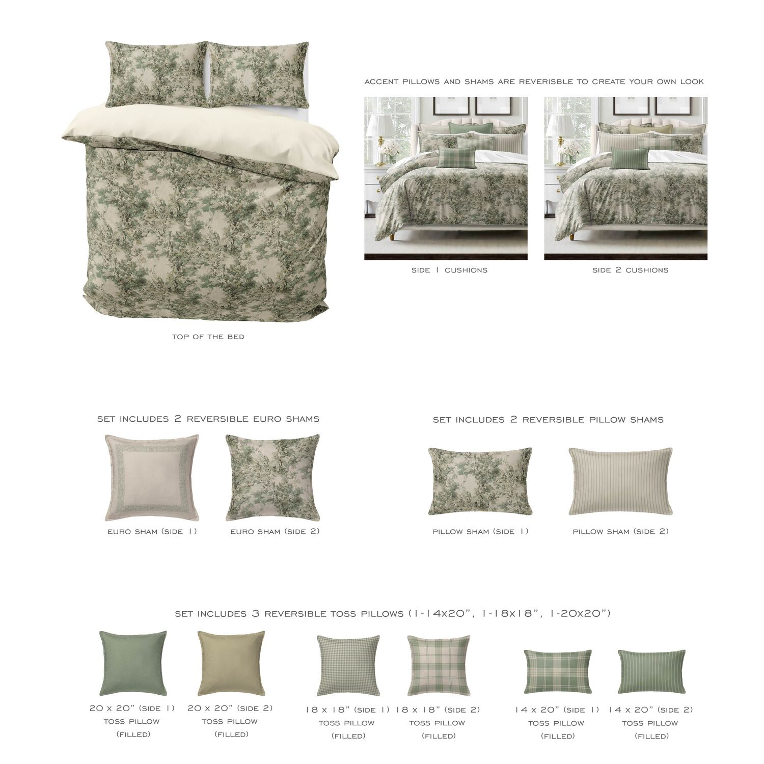 Duvet Cover 106"x96", 2 Pillow Standard Shams 20"x36", 2 Euro Shams 26"x26", 1 Square Pillow 20"x20", 1 Square Pillow 18"x18" and 1 Rectangle Pillow 14"x20". Duvet Cover has 6 ties sewn inside to secure insert and zipper closure.