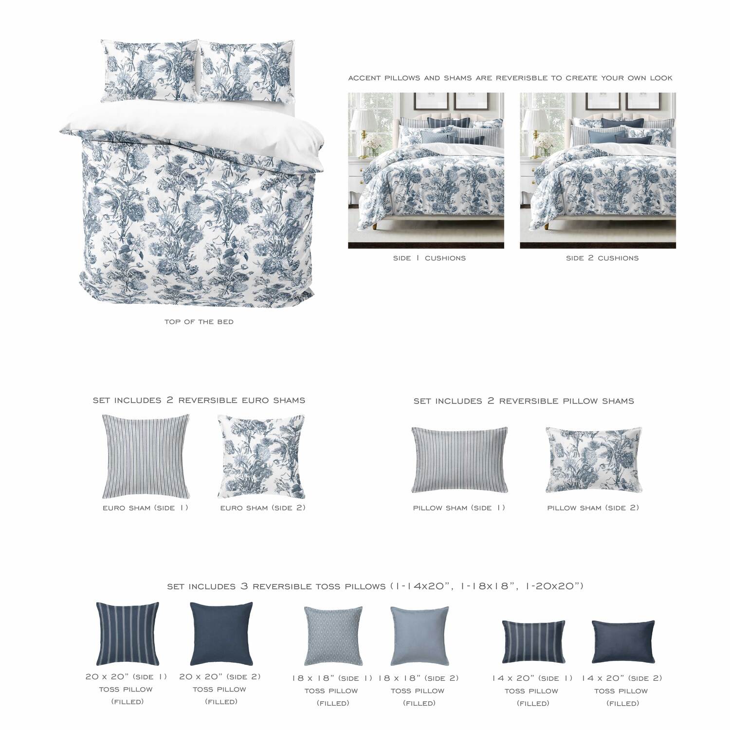Duvet Cover 106"x96", 2 Pillow Standard Shams 20"x36", 2 Euro Shams 26"x26", 1 Square Pillow 20"x20", 1 Square Pillow 18"x18" and 1 Rectangle Pillow 14"x20". Duvet Cover has 6 ties sewn inside to secure insert and zipper closure.