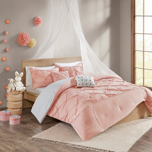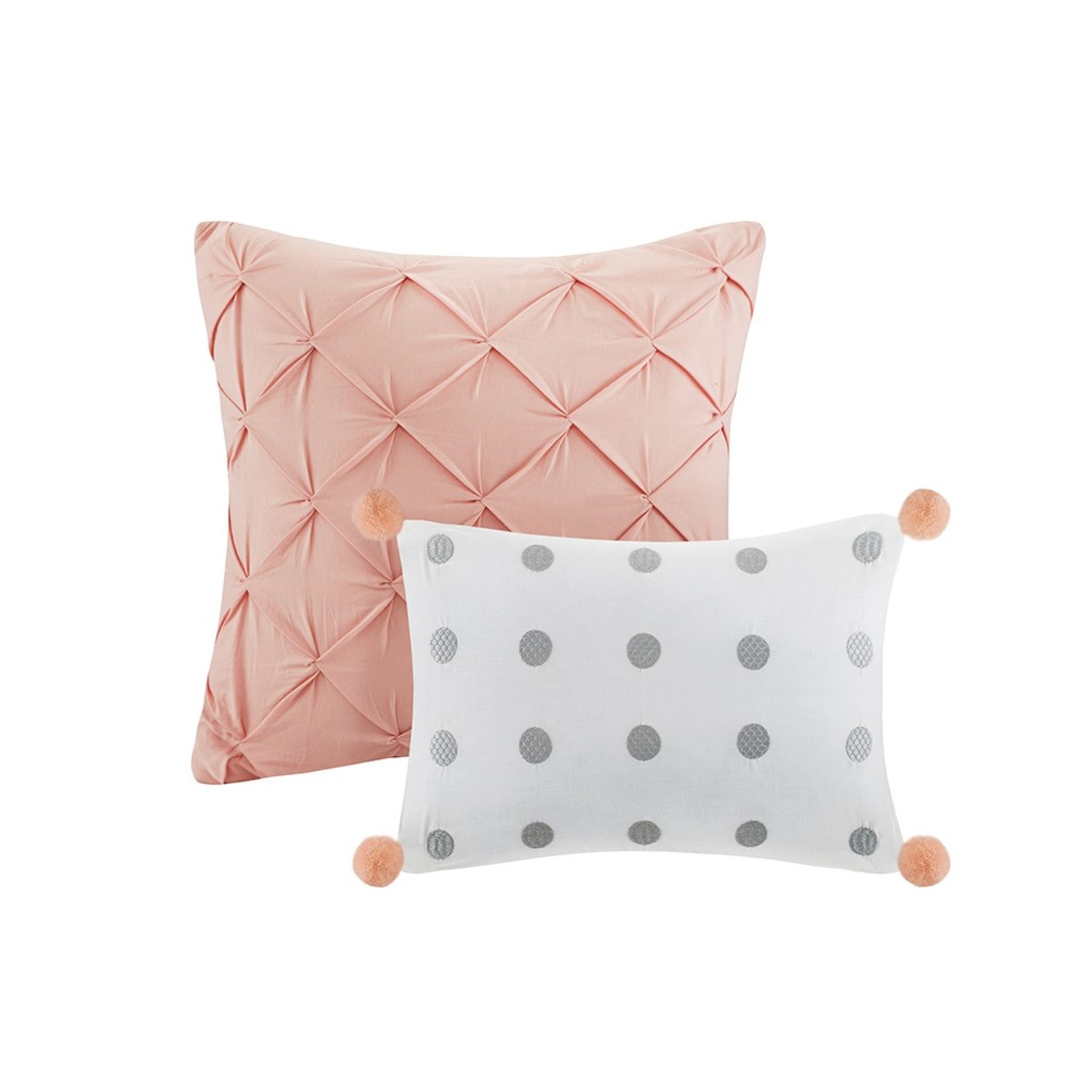Aurora Blush Coverlet by Intelligent Design introduces texture, color, and charm beautifully to the bedroom. Featuring a blush hue accented with gathering on the face and a reverse of gray polka dots, the Aurora Blush is reversible for two distinct designs. Aurora Blush is offered in bedding sets in sizes Twin to Queen. Bedding sets are available in your choice of comforter or duvet cover and also include pillow shams(s), and two decorative cushions. Aurora Blush is 100 percent cotton fabric, fill is 100 percent polyester. Machine washable following manufacturers directions.