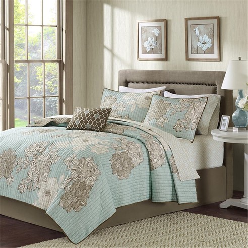 Avalon Blue by Madison Park will transport you to a tropical retreat instantly. The grand floral featured on the Avalon is spectacular as it covers the coverlet and matching pillow shams. The charming printed sheet set adds an additional pattern for completely coordinated appeal. The Avalon collection is available in Twin through California King size sets. Bedding sets include coverlet, pillow sham (s), flat sheet, fitted sheet, pillow case(s), and decorative cushion. Featuring 100 percent polyester fabric on coverlet, shams and decorative cushion. Sheet set is 100 percent cotton. Machine washable following manufacturers directions.