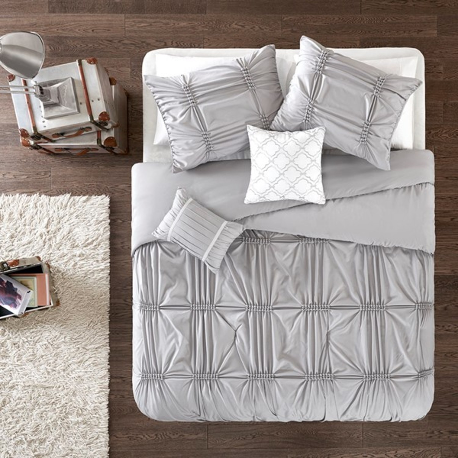 Benny Grey by Intelligent Design is a gorgeous bedding collection of modern color and wonderful texture. The fabulous pleating details add volume and drama to this beautiful modern style. Benny Grey is offered in comforter and duvet cover sets in sizes Twin to Queen. Made of 100 percent polyester and machine washable following manufacturers directions.