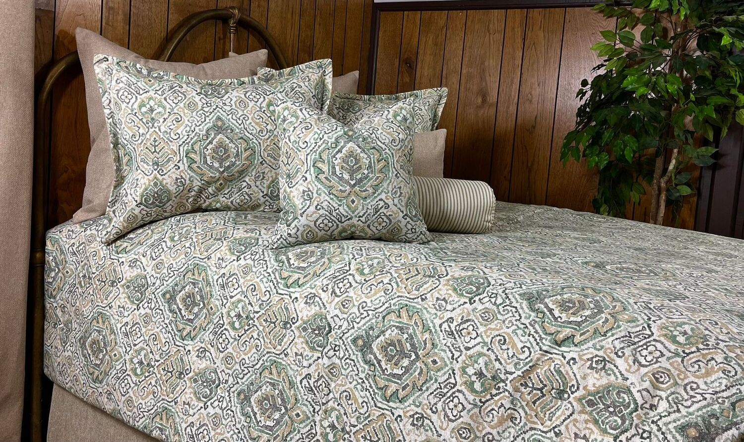 Bethany by Victor Mill is a trendy pattern. This modish pattern is done in soft colors. The set can be custom made to fit your needs. You can carry this theme throughout your home by adding decorative cushions, window treatments and even adding a shower curtain! These items are custom made in the USA.