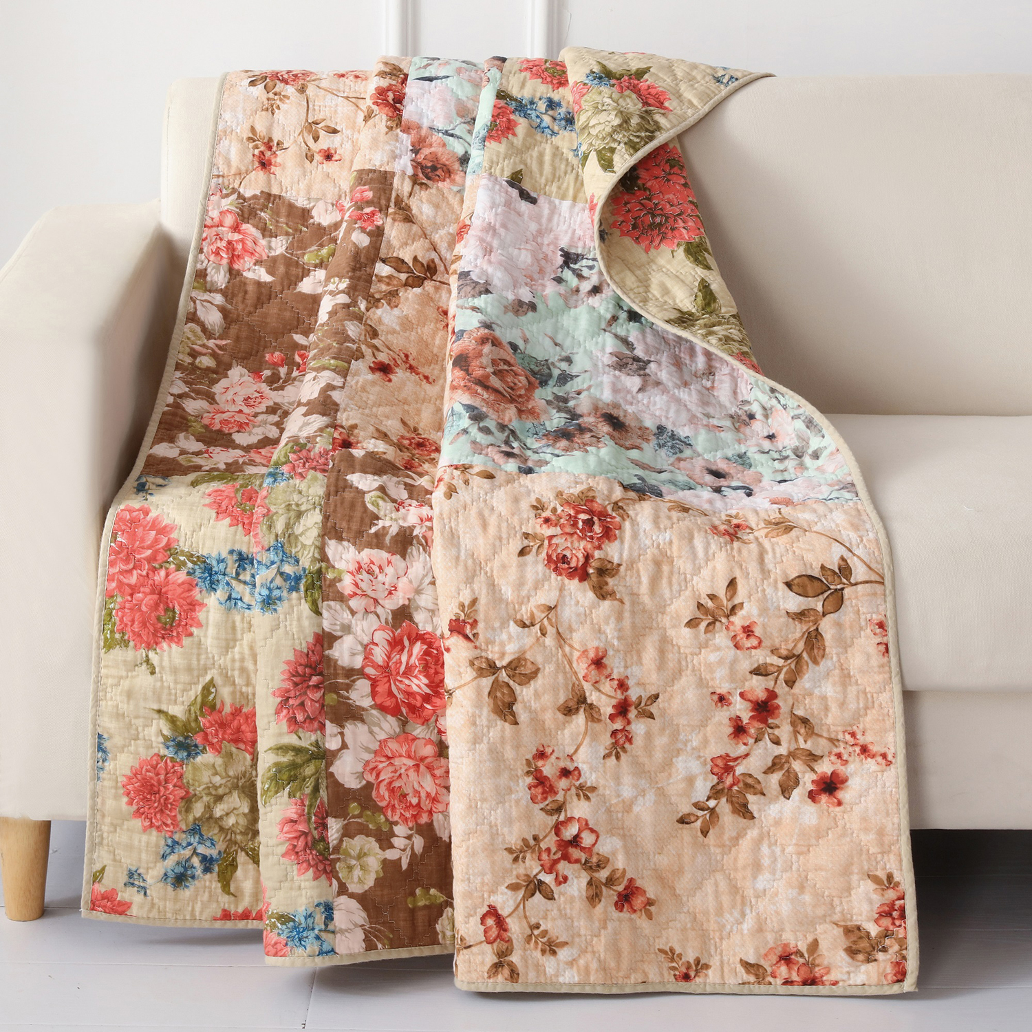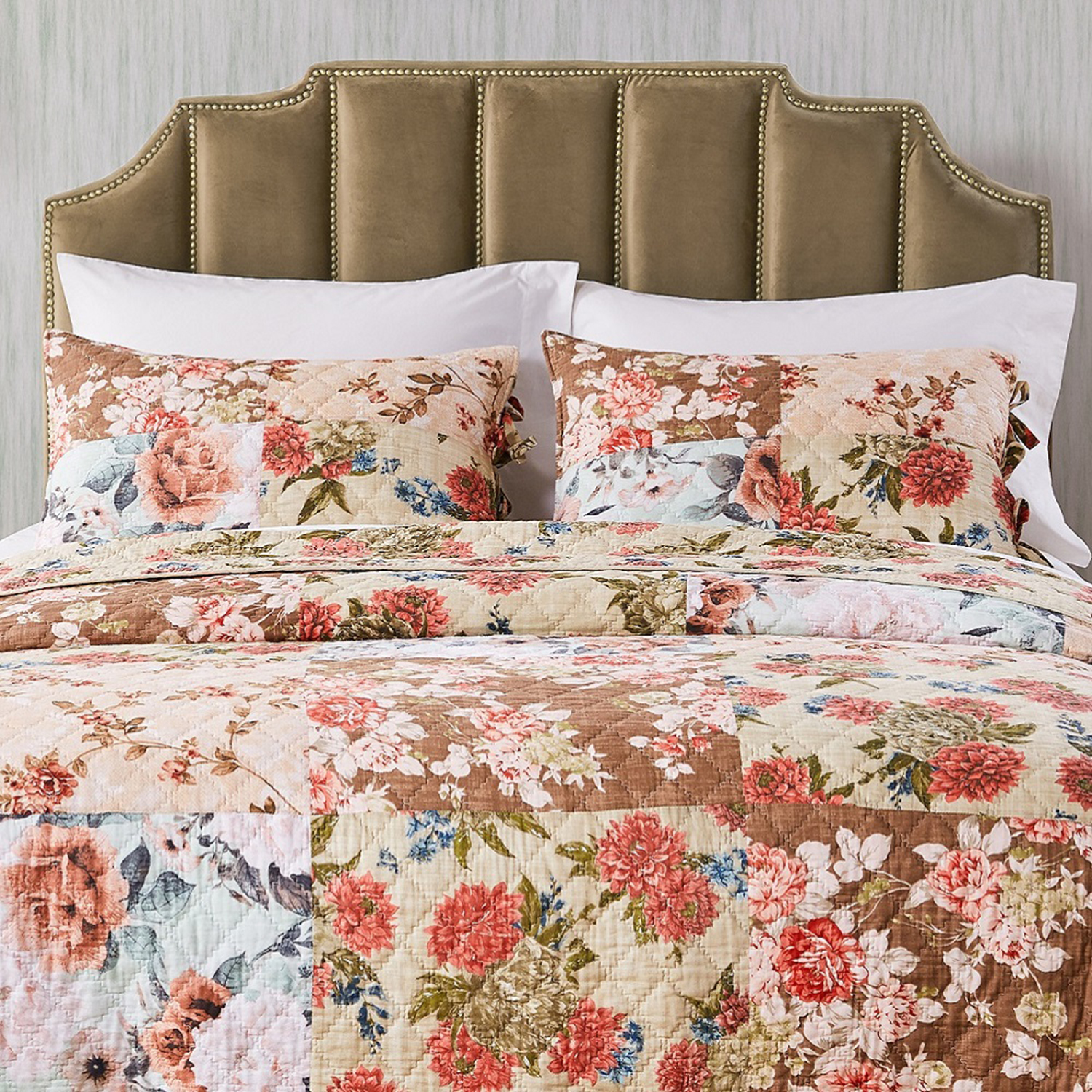 Briar by Greenland Home Fashions is a wonderfully traditional patchwork design. The Briar presents a lovely collection of florals in a timeless style. The Briar reverses to a complimentary print fabric on the quilt and pillow shams. Briar is available in quilt sets in Twin, Full/Queen and King sizes. Quilt sets include quilt and pillow sham(s). Briar also offers pillow shams, decorative throw, drapery valance, and drapery panels. Quilts and pillow shams feature 100 percent cotton face, and microfiber polyester reverse, with a cotton and polyester blend fill. Machine washable following manufacturers directions.
