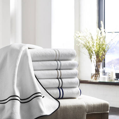 Borderie Towels by Kassatex Fine Linens are made from 100% long staple Turkish cotton and feature your choice of colored Double Line Embroidery and Piping. Choose from navy, seafoam, or pearl ad the piping on these soft and absorbent white towels. Machine wash cold, tumble dry low-medium. Do not bleach. To preserve color please avoid cleansers with harsh chemicals including Benzoyl Peroxide.