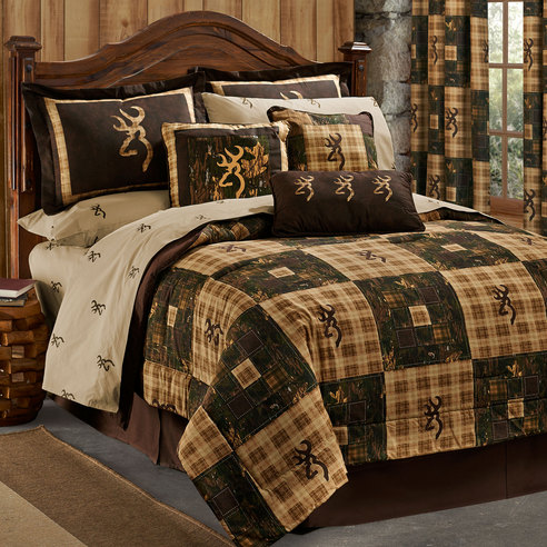 Browning Country by Browning gives the perfect blend of country and game hunting style to your room. All inspired from nature the earth tone plaids mix perfectly with the darker camo patches to give this bedding light and dark areas and make your space look classically styled. Browning Country is available in comforter sets as well as sheet sets, 3 sizes of decorative pillows, window covers, and a shower curtain. Browning Country is made from a cotton polyester blend and is machine washable.