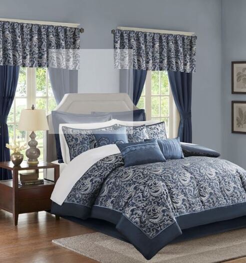 The Madison Park Essentials Brystol 24 Piece Room in a Bag provides a total makeover for your bedroom decor. This traditional comforter flaunts a navy, grey, and silver jacquard paisley pattern with an accenting solid navy border to create a luxurious glam look. Matching pillow shams and solid blue Euro shams with 2-inch flanges coordinate beautifully with the elegant comforter. A solid navy bed skirt and 4 decorative pillows with embroidery and pleating details add the finishing touches to this paisley bedding set. Hypoallergenic polyester filling in the comforter and pillows contains no allergens and is treated to be dustproof. A 4 Piece sheet set is also included to complement the comforter and complete the jacquard bedding set. To elevate your bedroom, 4 solid blue window curtains with 2 paisley valances and 2 solid tiebacks are included to perfectly style your windows. Machine washable for easy care, this paisley comforter set may come in rolled or compressed packing and will need to be fluffed up. Use a steam iron to help remove wrinkles easier. Spot clean pillows.