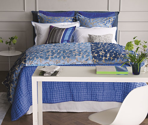 Calaggio Cerulean by Designers Guild Bedding is a stunning design in rich velvet. The design features leaves and berries in a beautiful blue velvet over a warm background shade. The natural design is made lux with the use of the velvet for amazing texture and softness. The reverse of the Calaggio Cerulean is a sophisticated neutral satin which would allow you to completely reverse the duvet cover for two individual styles. The Calaggio Cerulean collection includes duvet cover and euro sham in the gorgeous pattern. Coordinating with the collection are the Tribeca fitted sheet, Astor Cobalt flat sheet, and the Chenevard Cobalt and Cerulean quilt and shams. Calaggio Cerulean is available in Queen and King sizes.