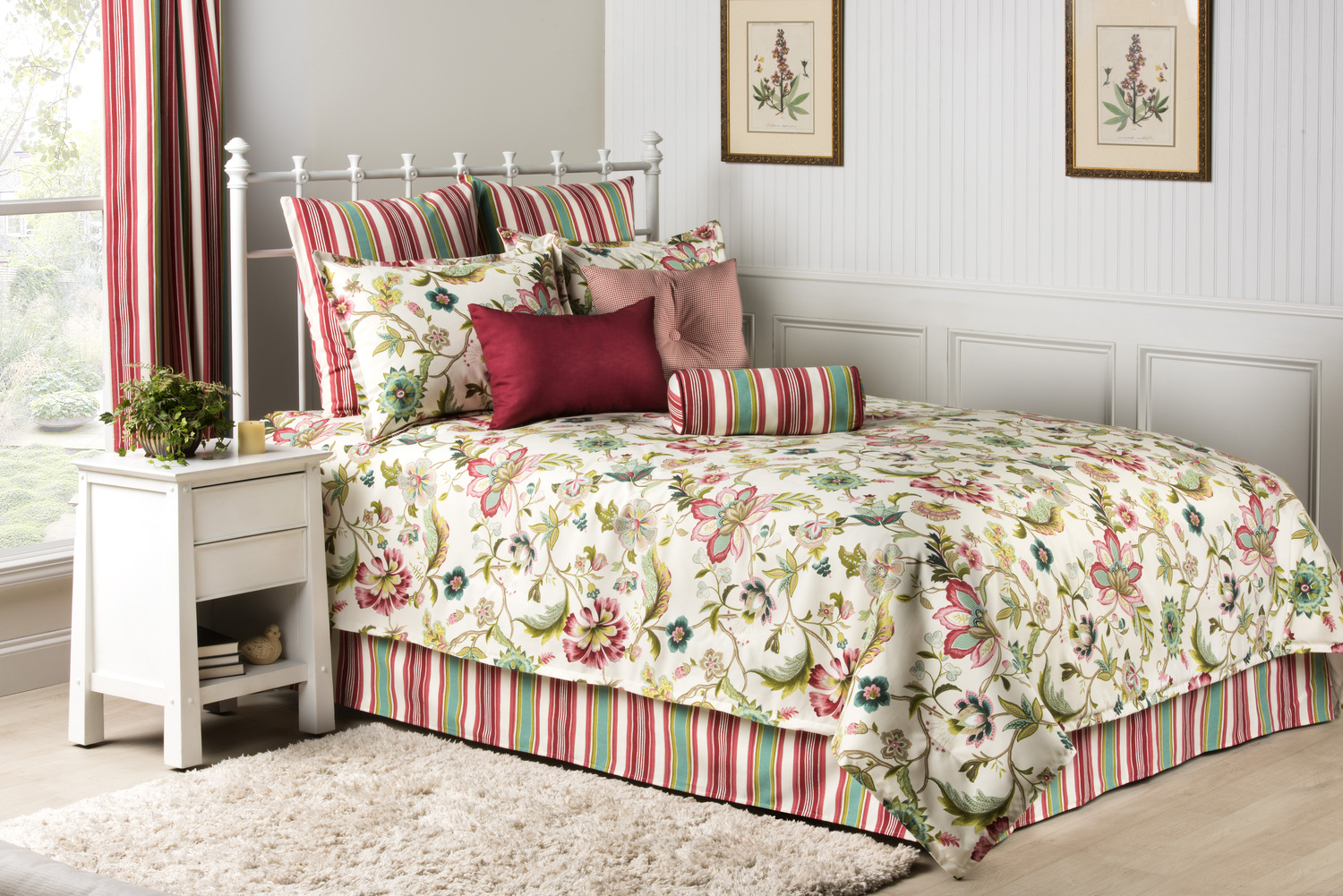 Charleston by Victor Mill features a gorgeous floral design in a lovely traditional color presentation. The Jacobean inspired floral design features shades of red and green with neutral hues. The coordinating stripe, solid, and check fabrics are featured as lovely accents to the Charleston. Charleston is available in sizes to accommodate Twin to California King as well as daybeds. The wide selection of choices include comforters, duvet covers, quilts, decorative cushions, drapery valance and panels, and shower curtain. Victor Mill Bedding is a Special Order and is made for you. Please note that this bedding can be customized to accommodate your design and size requirements, simply call us for a quote. Victor Mill Bedding is made in the USA. Charleston fabric is 65 percent polyester, 35 percent cotton. Please dry clean.