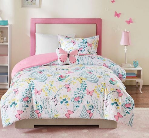 The Mi Zone Kids Cynthia Printed Butterfly Comforter Set adds a whimsical touch to your child’s bedroom. The ultra-soft comforter features a colorful butterfly print for a sweet, charming look, paired with a solid pink reverse for a soft pop of color. Coordinating shams (one in Twin) with a 1-inch flange match perfectly, while a butterfly-shaped decorative pillow completes the set with an adorable finishing touch. Both the comforter and decorative pillow are filled with hypoallergenic material for added softness and comfort. The set is machine washable for easy care and includes an antimicrobial treatment that helps reduce odor-causing bacteria, keeping the bedding fresher for longer.