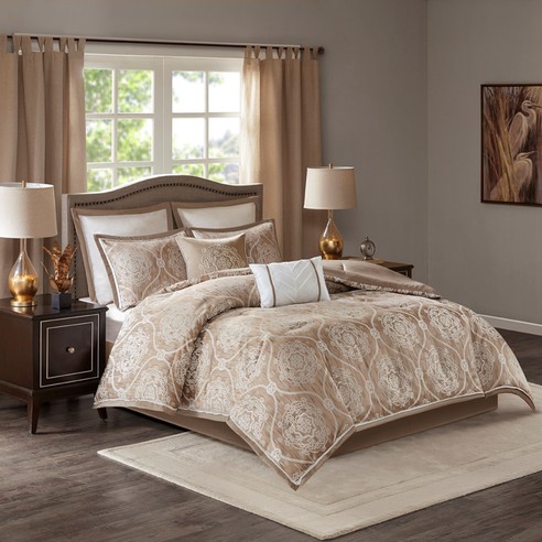Dora Taupe by Madison Park is regal and elegant. This beautiful bedding collection features wonderfully detailed medallions on the comforter and pillow shams in a modern shade of taupe. Complimentary shades have been selected for the euro shams, decorative cushions, and the tailored bedskirt. Creating a beautiful bed is wonderfully simple with the Dora Taupe which is available in bedding sets in Queen through California King sizes. Bedding sets include comforter, pillow shams, euro shams, decorative cushions, and bedskirt. Made of polyester, machine washable following manufacturers directions.