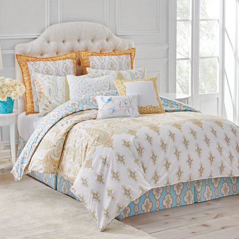 Dream by Dena Home features a gold and aqua paisley print on the face and a blue medallion print on the reverse. Dream is offered in Comforter Sets which include the pillow sham(s), Duvet Covers, Quilts, and Bedskirts available in size Twin, Full/Queen, and King sizes. Dream also offers Pillow shams in size Standard (Quilted and not), King, and Euro and 2 decorative pillows. Dream is 100% cotton with 100% polyester fill and is machine washable.