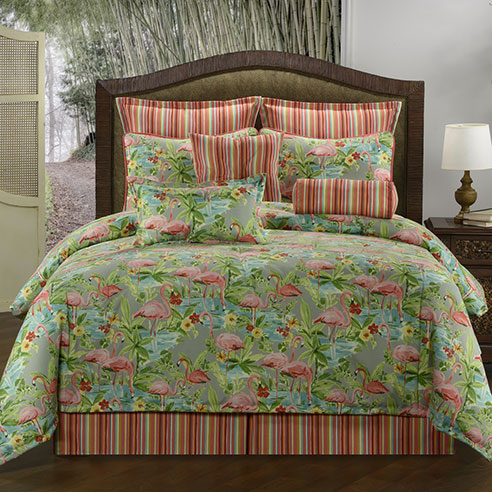 Flamingo by Victor Mill emerses you completely in the tropical style with beautiful colors and lively design. The Flamingo delights with shades of pink, blue, green and a touch of yellow as the elegant birds cover the top of the bed. Charming and lighthearted, the Flamingo collection features a complimentary stripe fabric on the bedskirt, euro shams and decorative cushions. Flamingo is available in sizes to accommodate Twin to California King as well as daybeds. The wide selection of choices include comforters, duvet covers, decorative cushions, drapery valances and panels, and shower curtains. Victor Mill Bedding is a Special Order and is made for you. To ensure that this collection is absolutely perfect, please request a fabric swatch to confirm color and fabric suitability. Please note that this bedding can be customized to accommodate your design and size requirements, simply call us for a quote. Victor Mill Bedding is made in the USA.