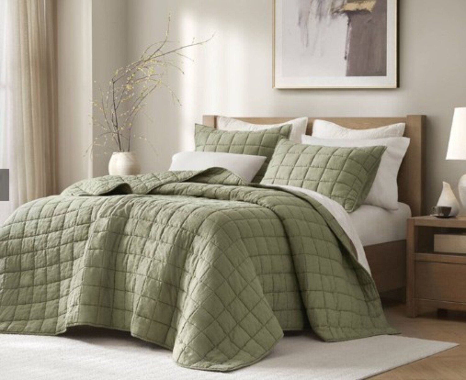 French Flax Olive Green Linen Garment Washed Quilt Set Full/Queen Set Includes: 1 Quilt: 92"W x 92"L and 2 Standard Shams: 20"W x 26"L 92"x92" $600.99 USD