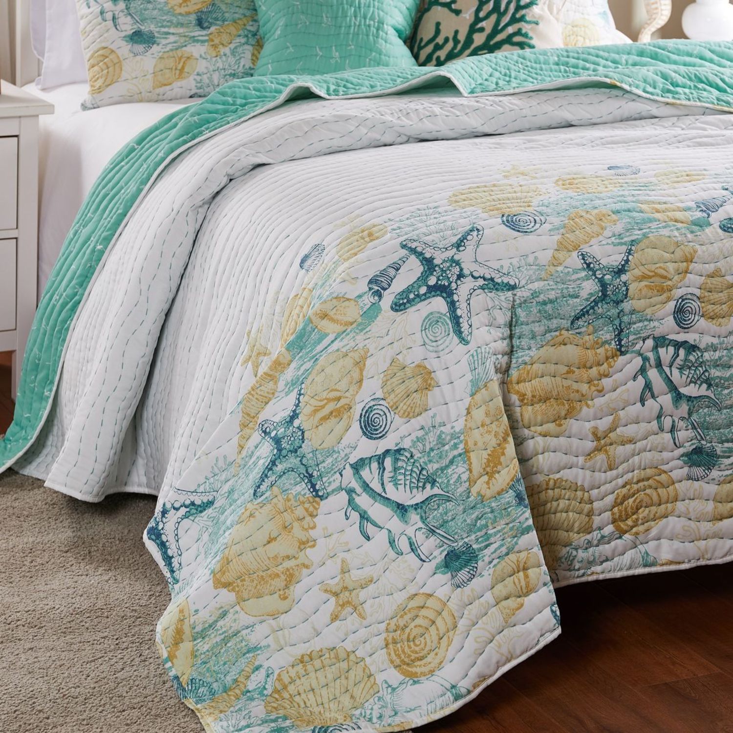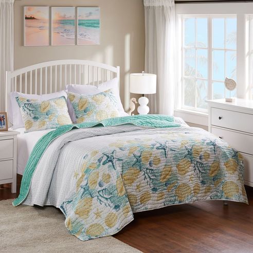Grand Bahama by Greenland Home Fashions is a charming tropical design in cool shades. This intriguing design is a wonderful addition to your waterfront home or vacation inspired space. Grand Bahama quilt and pillow shams reverse to an complimentary fabric. Grand Bahama quilts are available in sizes Twin through King. Pillow shams, shower curtain, drapery panels, and decorative throw are also offered in the Grand Bahama design. Bedding is made of 100 percent polyester microfiber fabric and polyester fill, and is machine washable following manufacturers directions.