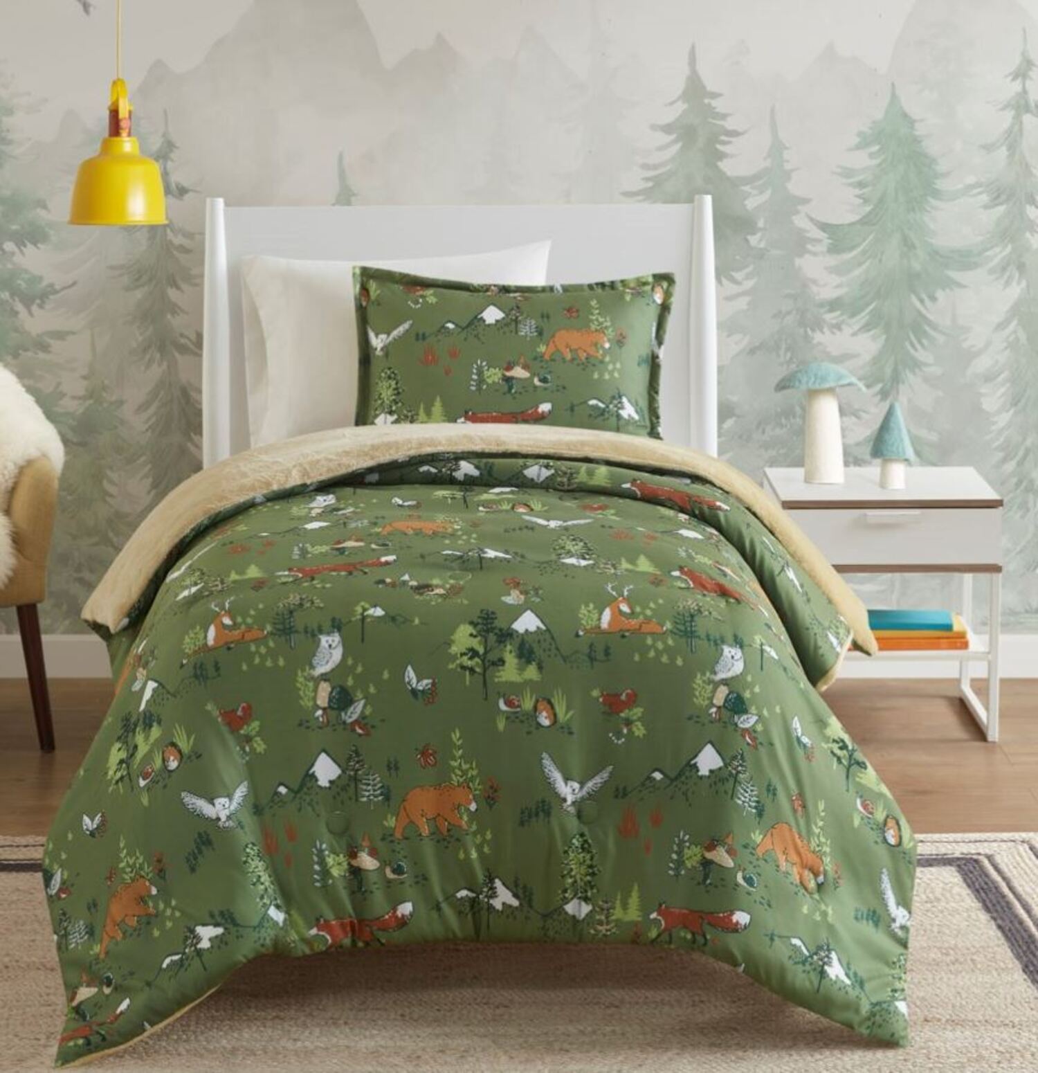 Let your child snuggle up with their favorite forest friends with the Mi Zone Kids Heath Plush Reversible Comforter Set. The cozy comforter and matching shams (one in Twin) showcase an adorable forest animal print that brings a fun, woodland-camping feel to their room. The plush reverse adds an extra layer of softness, making it perfect for cuddling. Filled with hypoallergenic, dustproof polyester, the comforter helps ensure a comfortable night’s sleep. The set is machine washable for easy care and OEKO-TEX certified, featuring an antimicrobial treatment that keeps the fabric fresher and longer lasting.