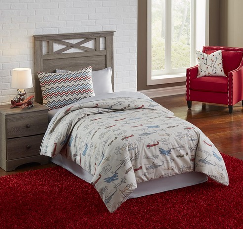 Kiddy Hawk by Riverbrook Home Bedding is an adventurer's dream come true. The airplane theme is presented in shades of blue and red on neutral. The balance of pattern and color is absolutely perfect. Inspired design for your youths bedroom, the Kiddy Hawk is available in Twin and Full/Double sizes. The bedding sets include duvet style comforter, and pillow sham (s). Made of polyester and machine washable following manufacturers directions.