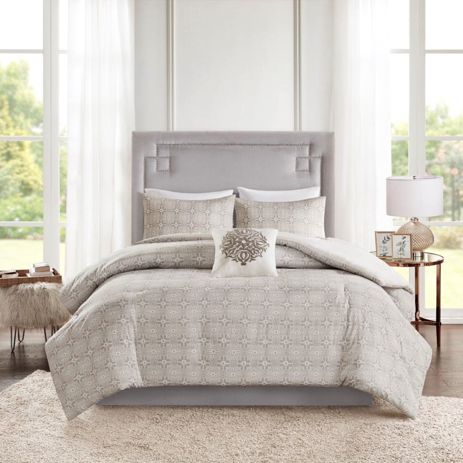 Malia by Madison Park is a beautiful design with modern hues and wonderful texture. Featuring grey embroidery on an ivory background the face of the Malia offers the sophisticated texture of pintucks. The reverse is a grey medallion printed design. Malia is available in your choice of comforter sets or duvet cover sets in sizes Full through California King. Comforter sets include comforter, pillow shams, euro shams, and decorative cushion. Duvet cover sets include duvet cover, pillow shams, and decorative cushion. Machine washable following manufacturers directions. Please note: comforter set is shown in main photo.