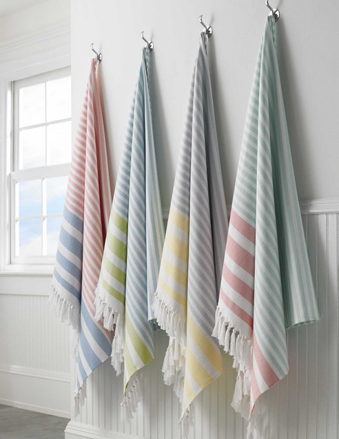 Milas Beach Towels by Kassatex Fine Linens are light weight and absorbent and perfect for your summer plans. These towels are 100% cotton and are accented with hand knotted fringe. Machine wash cold, dry on low-medium heat, and do not bleach.
