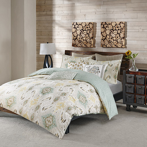 Nia Seafoam by Ink and Ivy Bedding plays with muted colors and ikat design for the perfect boho look. Seafoam and yellow create the perfect color blance with its stunning design. A seafoam chevron pattern on reverse give this bedding unlimited styling options. Nia Seafoam is available in sizes full/queen as well as king/california king and comes in comforter or duvet cover sets.