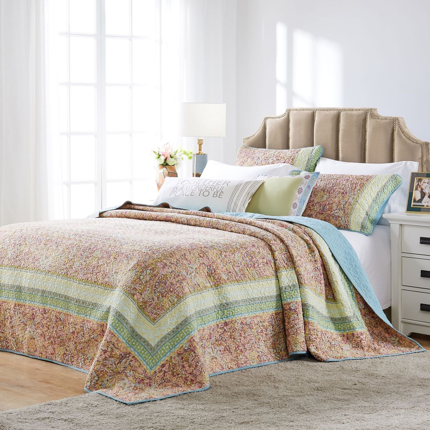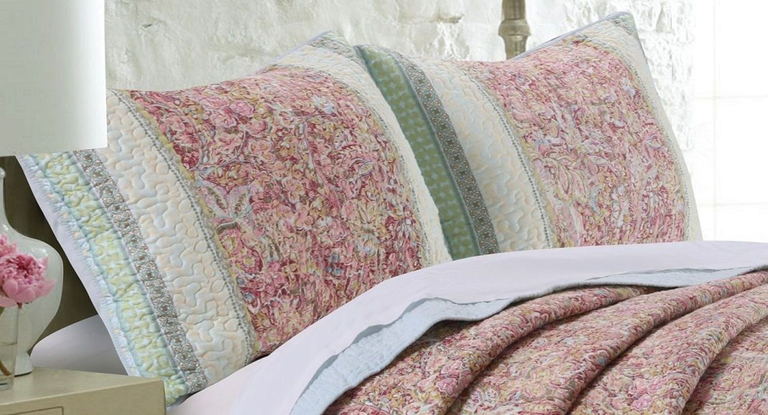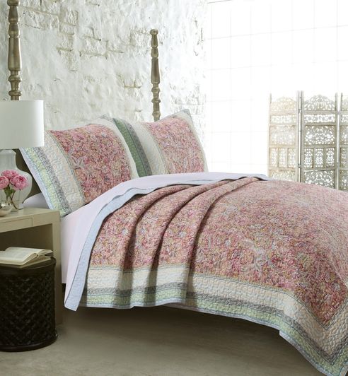 Palisades by Greenland Home Fashions is a lovely bedding collection with delicate details and charming hues. The bedding is accented by a stylish border detail. Palisades is available in Quilt Sets and Bedspread sets in sizes Twin through King. Set include the quilt or bedspread and pillow sham(s). Palisades offers additional pillow shams, and decorative throw to complete your design. Palisades features 100 percent polyester microfiber on the face, with 100 percent cotton on the reverse. Fill is 60% cotton, 40% polyester. Machine washable following manufacturers directions.