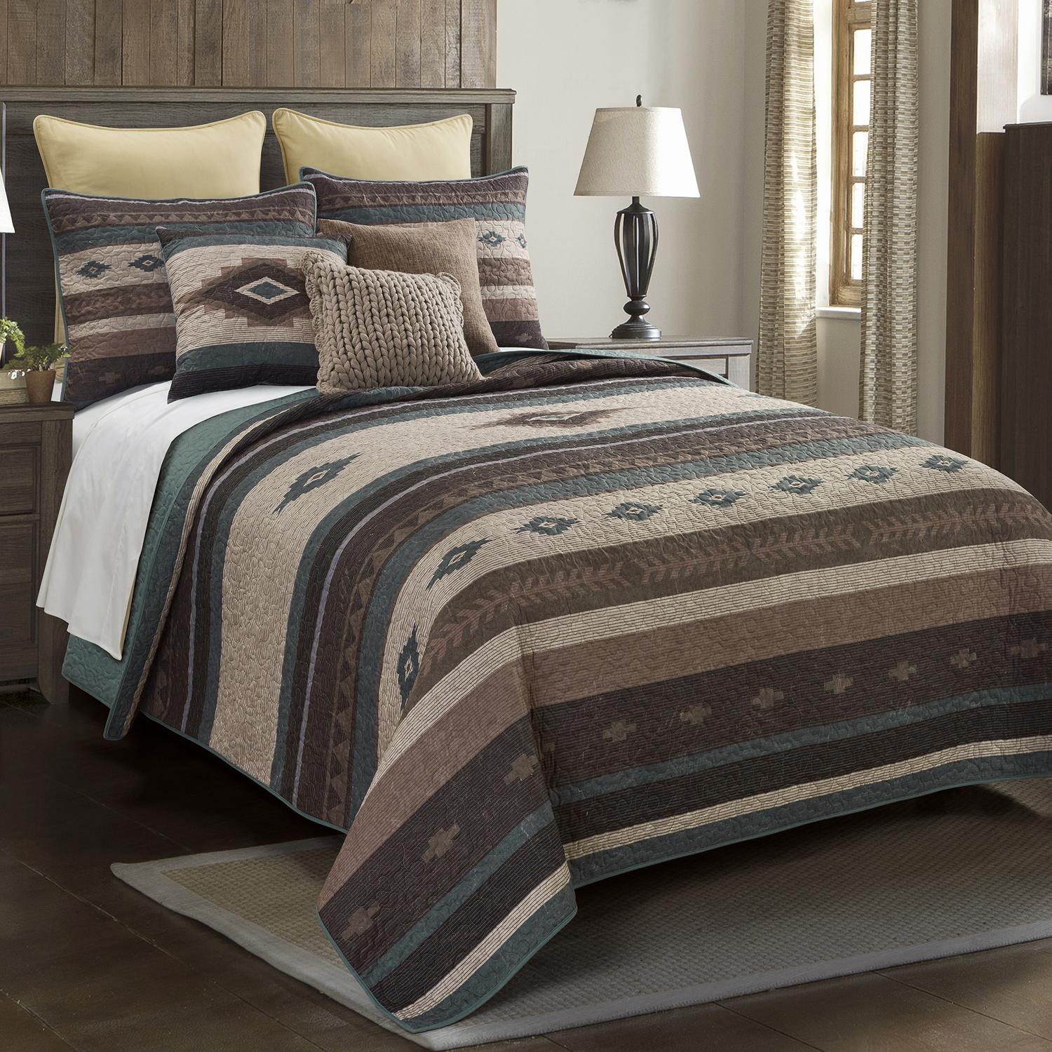Sierra Vista by Donna Sharp Quilts captures the traditional southwest style beautifully. The stylish Sierra Vista collection features horizontal bands depicting the traditional southwestern motifs in warm earth tones. The Sierra Vista collection features all over quilting stitch. Sierra Vista is available in quilts in sizes Twin to King. Also available is a decorative cushion to complete your design. Made of 100 percent brushed polyester fabric with a polyester and cotton blend fill. Machine washable following manufacturers directions.