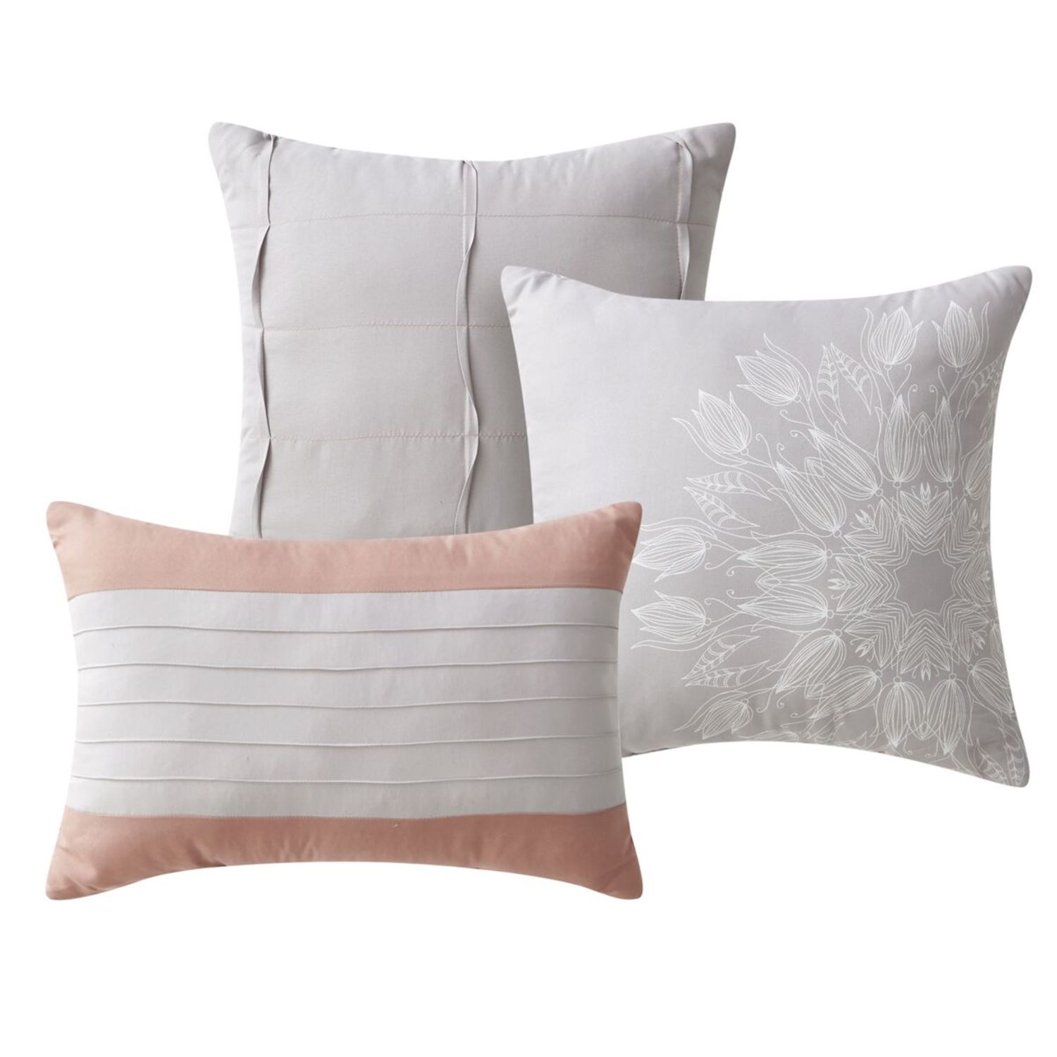 Solange by Sander features a complete bedding design in solid taupe with subtle pink accents. Solange is availalbe in Queen and King 7 Piece Comforter Sets which include the Comforter, Pillow Shams, Bedskirt, and 3 distinct Decorative Pillows. Solage is made from 100% Polyester and is Machine washable for easy care.