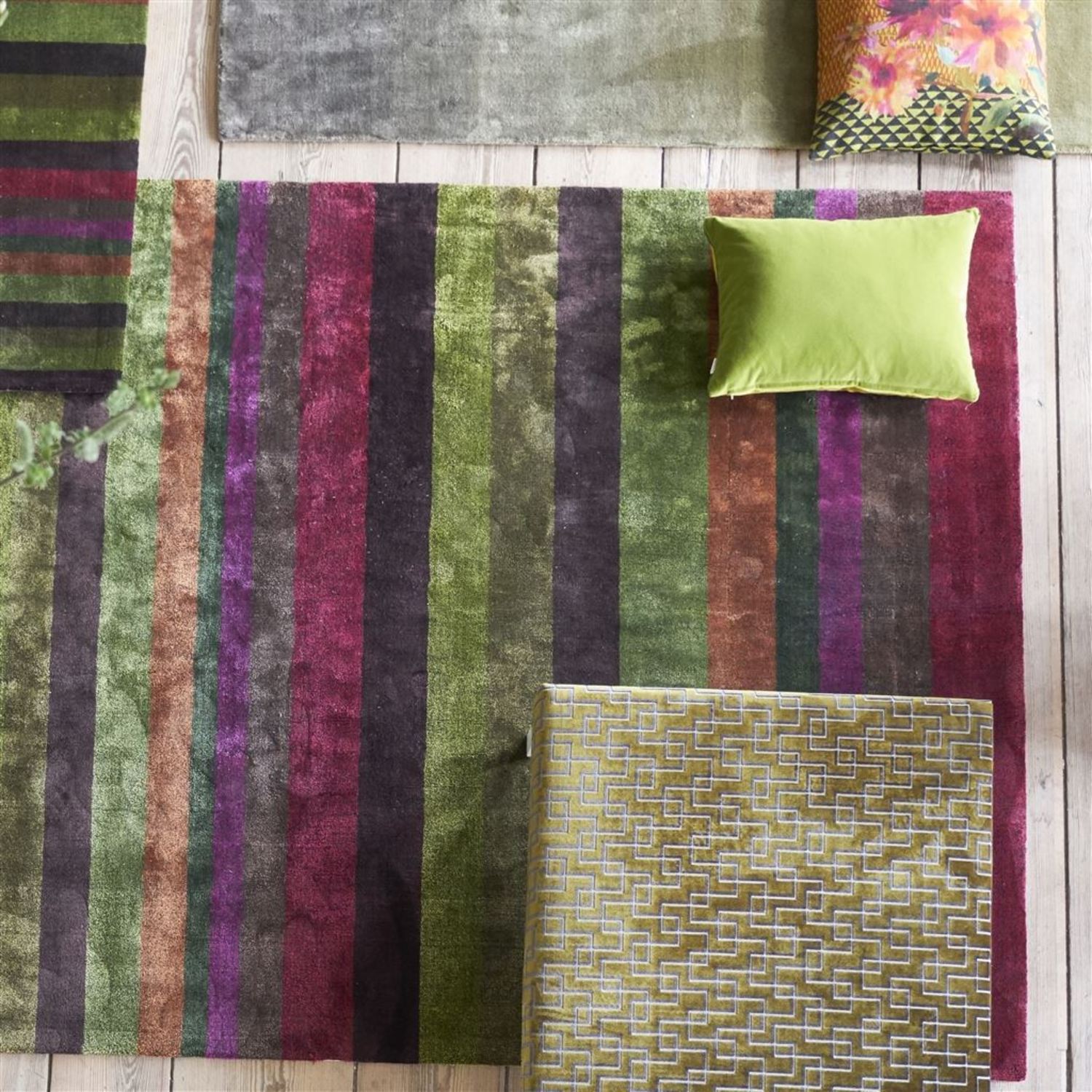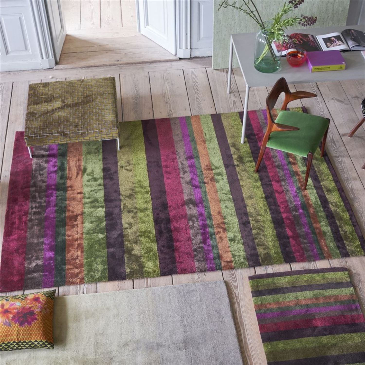 Tanchoi Berry by Designers Guild is a bold and vivid stripe design. This colorful creation is a statement which adds personality to any room. Tanchoi Berry is available in your choice of sizes. Hand Loom. Tanchoi features pile of 50 percent Tencel Lyocell, 50 percent Viscose, and a backing of 100 percent cotton.