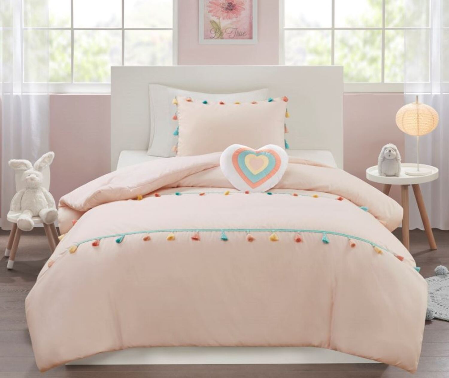 The Mi Zone Kids Tessa Comforter Set brings a playful touch to any child’s room with its colorful tassel accents. Simple, cute, and full of charm, the comforter adds a fun pop to their space. Matching shams (one included with Twin) and a heart-shaped embroidered decorative pillow complete the look with an adorable finish. Both the comforter and pillow are filled with hypoallergenic, dustproof polyester for added comfort and peace of mind. The set is machine washable for easy care and is also OEKO-TEX certified with an antimicrobial treatment to help keep the bedding fresher for longer.