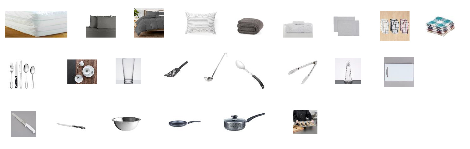 Ultimate Starter Package - 38PCS Set Includes 1 twin mattress protector, 1 basic twin comforter, 1 twin sheet set, 2 pillows, 1 blanket, 2 bath towels, 2 hand towels, 2 face cloths, 1 bath mat, 2 dish towels, 2 dish cloths, 2 utensil sets, 2 dish sets, 2 drinking cups, 1 spatula, 1 ladle, 1 stainless steel serving spoon, 1 tongs, 1 set of salt and pepper shakers, 1 medium mixing bowl, 1 small cutting board, 1 bread knife, 1 carving knife, 1 10"frying pan, 1 3QT cooking pot with lid and 1 medium baking sheet $349.99 USD