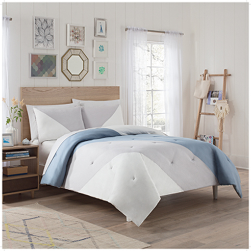 Beau Sky by Vue Bedding Collection is a bold stripe set on the diagonal. The fabulous scale of the Beau is complimented beautifully with the selected shades. This gorgeous statement bedding is available in comforter sets in sizes Queen and King. Made of microfiber fabric. Machine washable following manufacturers directions.