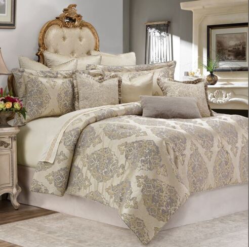 Bennett by Michael Amini is a luxurious bedding set that will add elegance and class to your bedroom. The rich texture of the jacquard fabric adds quality and detail to this bedding set. The cushions add elegance and compliment the set with a glamourous Hollywood style in your bedroom.