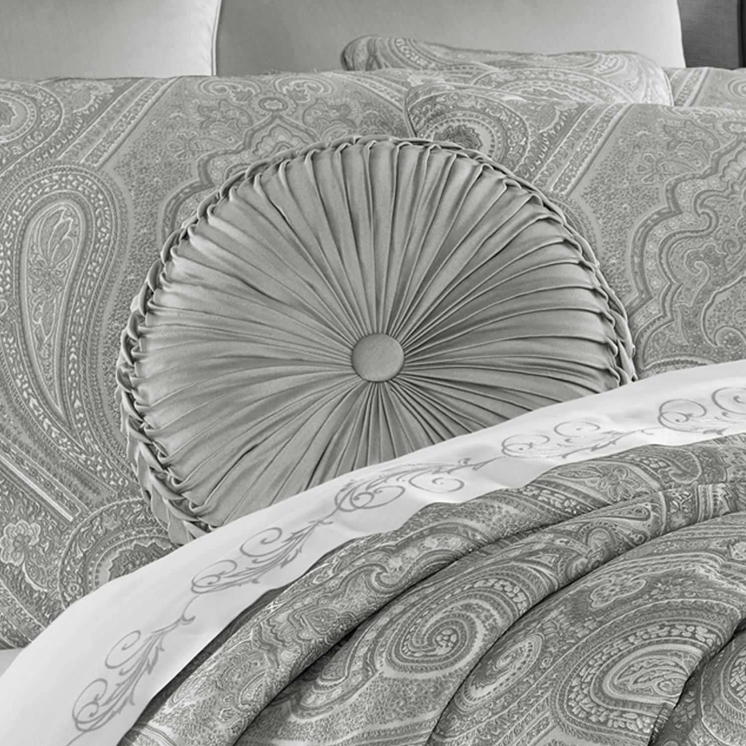 Brooklyn Silver by Five Queens Court Bedding is a striking paisley design in a gorgeous and modern hue. Brooklyn Silver provides the luxurious details of sophisticated designer details and accents throughout including complimentary fabrics, piping details, and stylish decorative cushions with innovative textures. Brooklyn Silver comforter and pillow shams are finished with a decorative piping touch as the edge. The tailored bed skirt completes the comforter set beautifully. Bedding sets are available in sizes from Queen to California King and include the comforter, matching pillow shams and bed skirt. Introduce the euro shams, shown against the headboard, for an elegant and traditional addition to the top of the bed. Brooklyn Silver offers two designer decorative cushions in Square and Tufted round styles. Coordinating drapery panels and drapery valances complete the bedroom style beautifully by introducing the Brooklyn Silver to your windows. Made of 100 percent polyester and dry clean care.