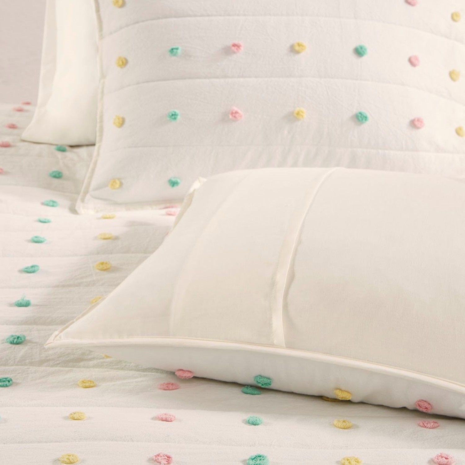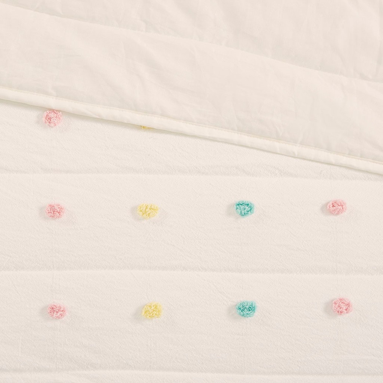 Callie Coverlet by Urban Habitat offers texture and wonderful charm. A soft white backdrop featuring channel quilting with the addition of rainbow chenille tufts, the texture is abundant. Callie is offered in coverlet sets in sizes Twin to Queen. Bedding sets include coverlet and pillow shams(s). Coverlet is 100 percent cotton fabric, fill is 100 percent polyester. Machine washable following manufacturers directions.