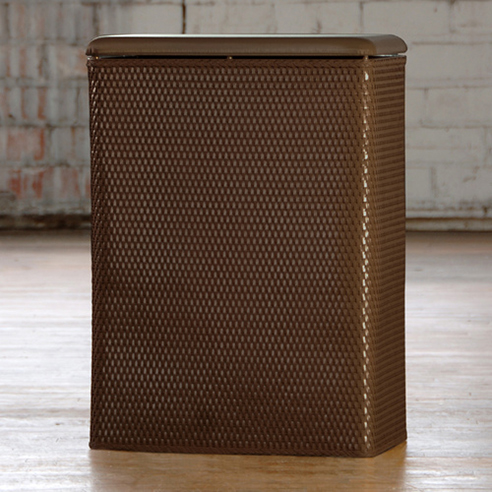 Carter Hamper Chocolate by Lamont Home features a hinged vinyl lid and a folded flat wicker with a snag proof interior. Carter is available in bench, apartment, family, and upright sizes and comes in white, cappuccino, linen, chocolate, and black.