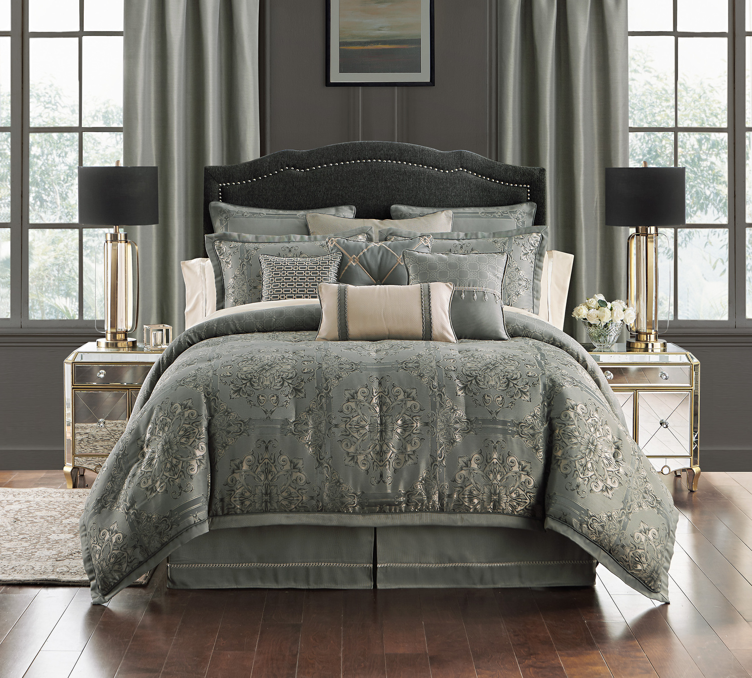 Dimitrios by Waterford Luxury Bedding Luxury Bedding is a classic design featuring contemporary hues. Presented in charcoal, the featured medallions are beautifully detailed. The Dimitrios collection features shades of charcoal and taupe which combine for a wonderfully neutral and elegant design. The comforter features a decorative flange detail at the edge and a complimentary pattern on the reverse. The decorative flange treatment is repeated on the matching shams for a touch of luxury. The euro shams add a complimentary fabric to the top of the bed and height to the pillow display at the headboard. The euro shams are reversible providing fabulous options to express your unique design style. Personalize your design with the addition of your choice of the available decorative cushions, as well as drapery panels and valances. Each of the decorative cushions has a special touch of trim, design or fabric choice to ensure a luxurious design is achieved. A bed skirt is also offered to complete the design. Bedding is available in Queen, King, and California King sizes. Dimitrios is offered in bedding sets which include comforter, pillow shams, and bedskirt. Made of 100 percent polyester. Please dry clean.