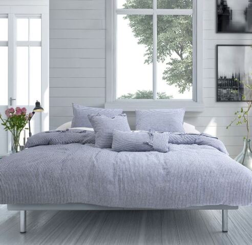 Grant Marine by Michael Amini is a vintage stripe set. The modern style duvet set is available as a five piece set which includes the duvet, two shams and two decorative cushions that are shown in the picture. Woven in China using Belgium flax linen, this natural fabric features bow tie closure on duvet. The set is 100% linen and machine wash.