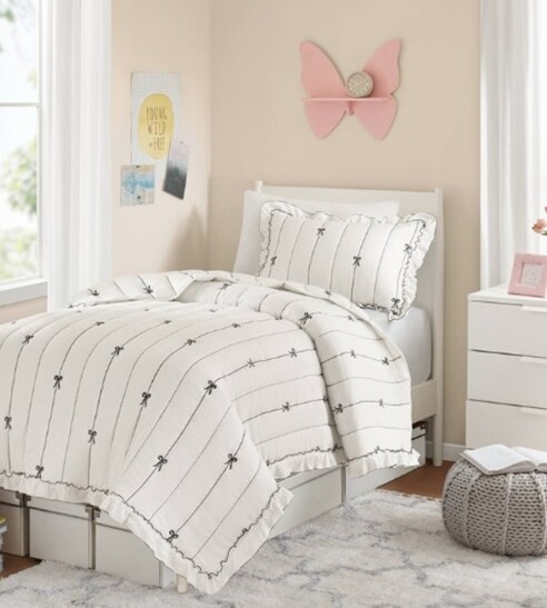 This quilt set features a playful bow embroidery design on a soft microfiber base, bringing a youthful and romantic charm to any bedroom. A delicate ruffle trim surrounds the quilt and shams, finished with color-coordinated stitching that complements the embroidery for a polished look. The high-quality embroidery adds refined texture and detail, creating a style that feels both elegant and modern. Made with pre-washed microfiber for exceptional softness and filled with a down-alternative for a light, cloud-like feel, this set offers both comfort and style. Designed with a sweet, feminine aesthetic, it’s perfect for creating a cozy and stylish retreat. The reversible design adds versatility, with a white front featuring bow embroidery and a soft reverse for two beautiful looks in one. Easy to care for, this set is machine washable and fade-resistant, staying soft and charming wash after wash.