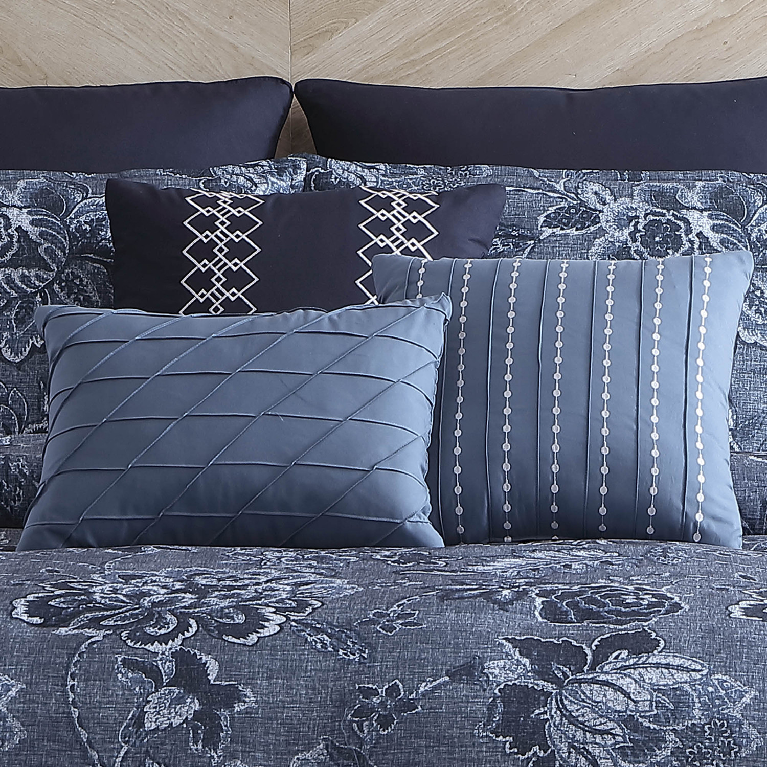 Monique by Riverbrook Home Bedding is a stylish bedding collection which offers a touch of tradition. This beautiful floral design features rich shades of blue for a wonderful appeal. Complimentary fabrics include gorgeous solids, textures, and accents found on the coordinated decorative cushions to complete the designer style. The Monique collection is offered in comforter sets in sizes Queen and King. Bedding sets include comforter, pillow shams, euro shams, and three decorative cushions. Made of 100 percent polyester fabric and fill. Machine washable following manufacturers directions.