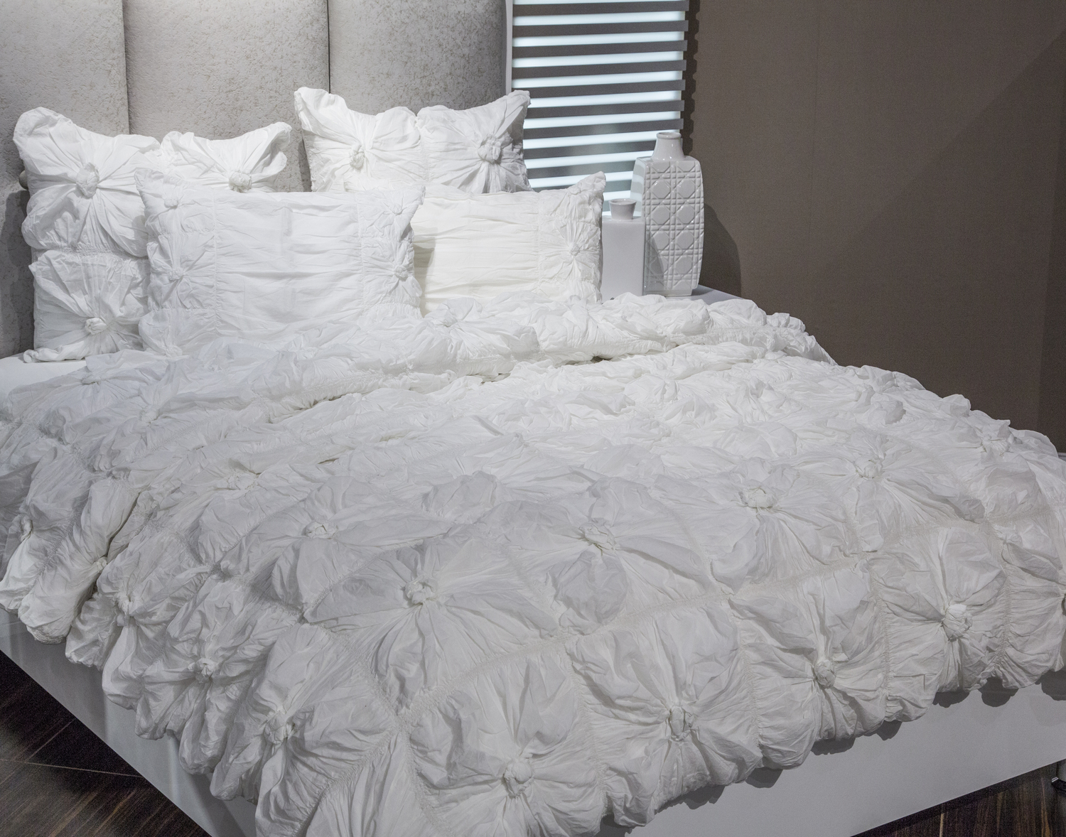 Savanna White by Michael Amini is rich in texture and style. The unique ruching created with the gathering of each square is remarkable. The Savannah collection is available in crisp white for a romantic and beautifully modern style. Savanna is available in bedding sets in Twin, Queen, and King sizes. The sets include comforter, pillow sham(s), and euro sham(s). Please dry clean.