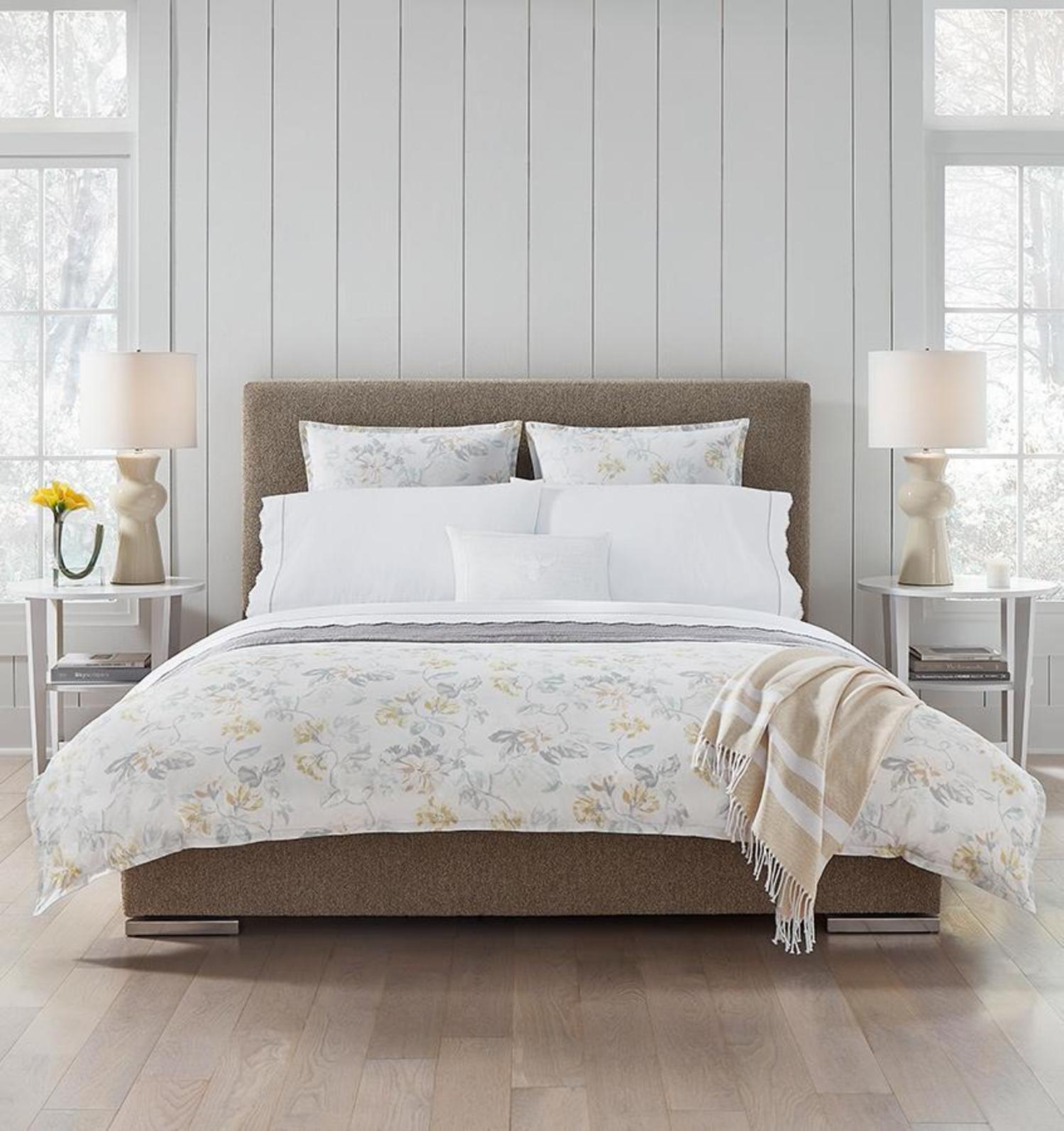 Spello by Sferra Fine Linens graces the bed with a gorgeous and sophisticated floral design. The soft shades of the Spello are gracious and timeless. Luxurious fabrics and gracious design create a look that is elegant and inviting. Spello is available as duvet covers, quilted coverlets, boudoir shams, standard pillow shams, king pillow shams, and euro pillow shams. Spello duvet covers and pillow shams are finished with a mini flange and plain hem. Made of 100 percent long staple cotton, yarn dyed sateen jacquard. The Spello collection is made in Italy to exacting standards. Spello is available in Twin through King sizes and is machine washable following manufacturers direction. The Spello collection is shown with the complimentary Allegra blanket, Pettine collection pillow cases in White and Tin, and the Colibri decorative cushion.