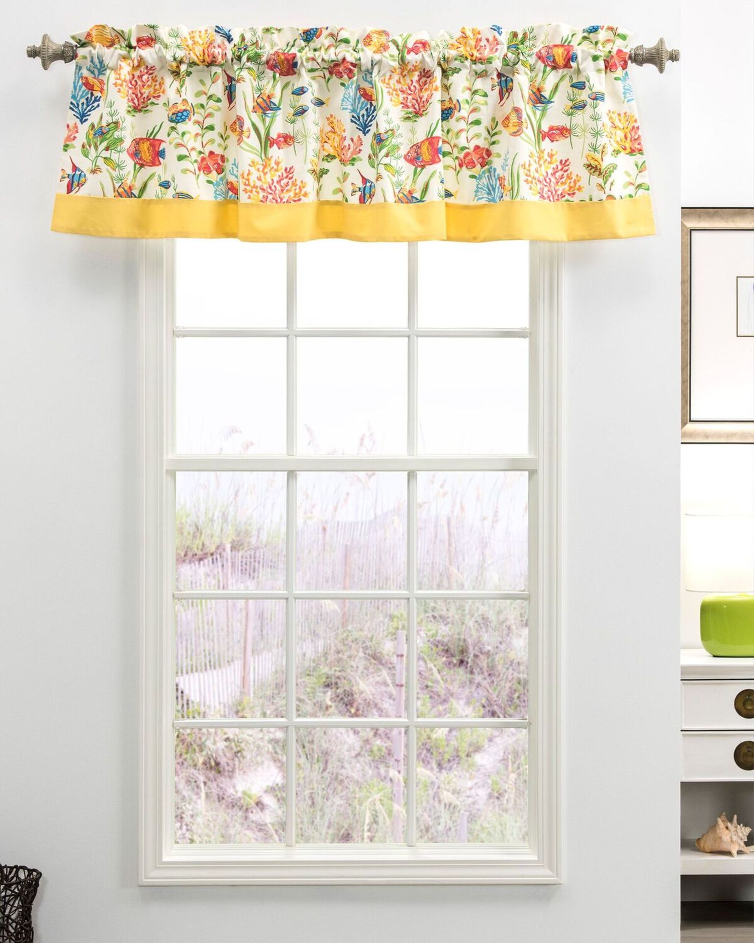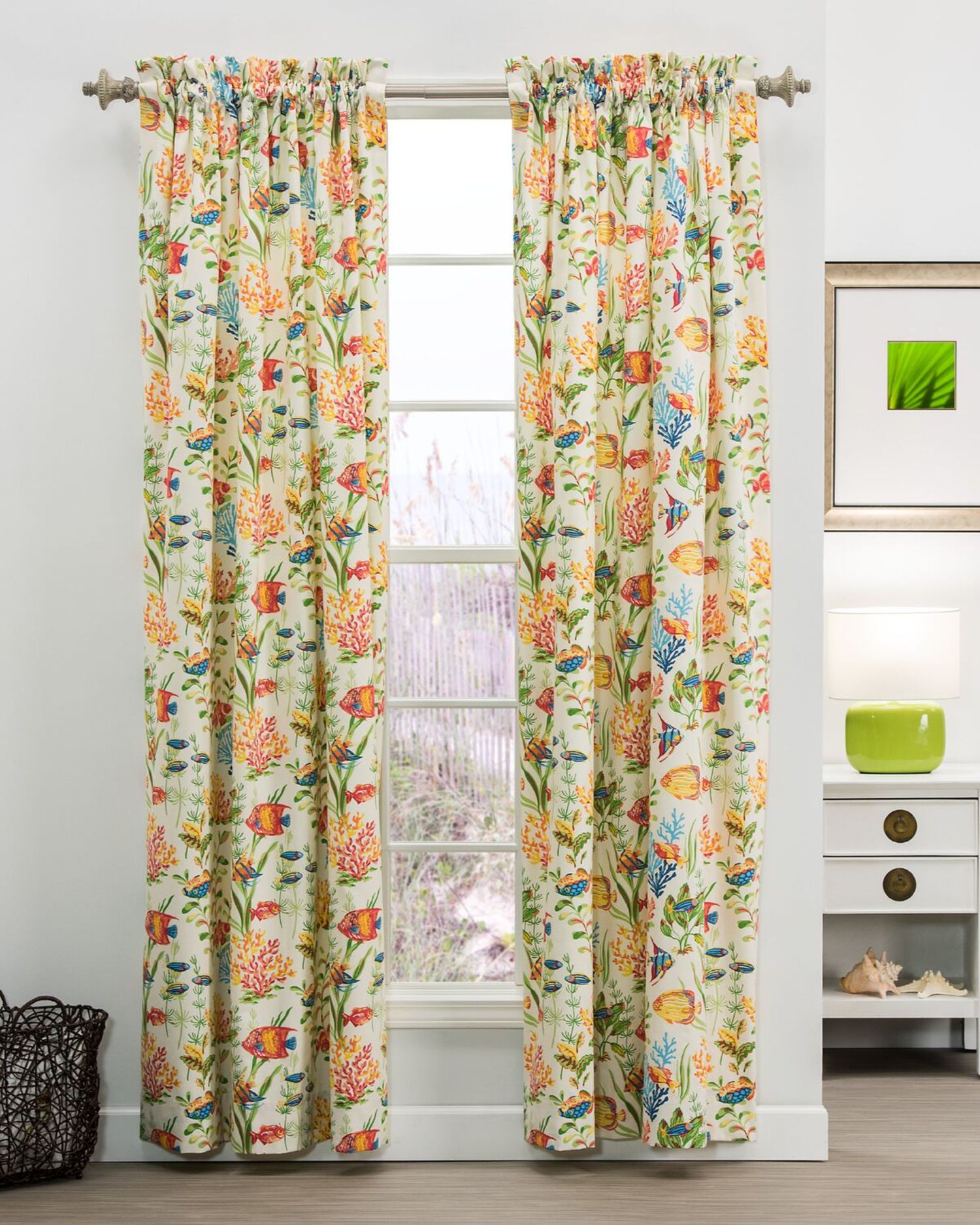 West Bay by Thomasville Home features a colorful underwater scene of tropical fish, plant life, and coral. Update your tropical inspired room with this bright and fun bedding shades of blue, teal, pink, red, yellow, orange, and green come alive with accents offered in solid bold colors. West Bay is offered in Comforter and Bed spread options and accent pieces that you choose to showcase the bed you want. West Bay is also offered in Drapery Panels and a variety of Valances. West Bay is made from 100% cotton and is recommended Dry Clean Only.