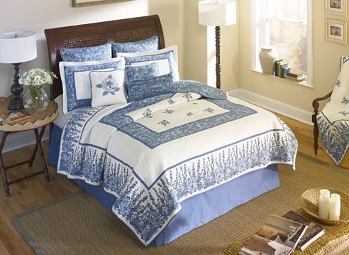 Azure Fields by Donna Sharp is a Wholecloth quilt, meaning the quilt is made of a solid piece of fabric which is then quilted together to the fill and backing of the quilt. A fresh spring field pattern done in periwinkle on a white base.