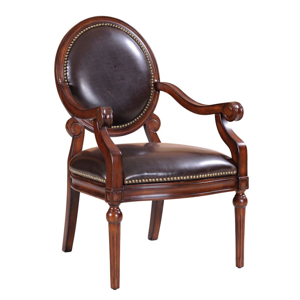 Madison Park Covington Accent Chair One. This hand carved chair with faux leather adds a dignified style to any elegant home. Rich colors and details such as the nail head trim come together for a beautiful result. Dimensions are 27.75" Width x 24.5" Depth x 38.75" Height