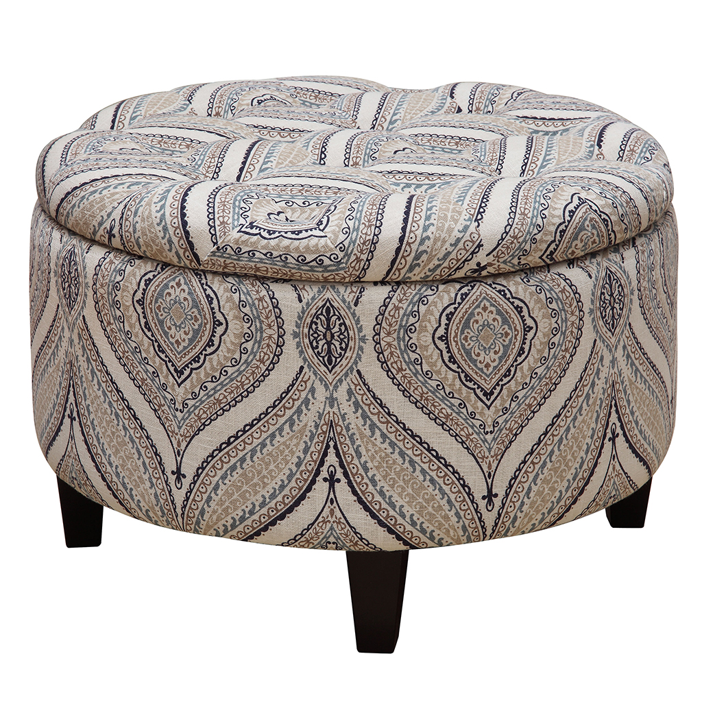 Madison Park Stefka Ottoman. Stylish storage! The Stefka ottoman is lined inside to provide additional storage in your living space with a great modern design. The tufted top and transitional fabric choice will maximize its appeal. Dimensions are 26" Round by 17.9" Height.