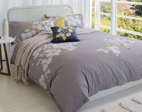 Summer Leaf by Kas Australia features a botanical vine design which grows in an organic pattern over the bed. The vine design features shades of modern greyish neutrals with touches of yellow. Summer Leaf pillow shams feature the duvet cover pattern also and can vary due to the size of the pattern. Summer Leaf is available in bedding sets for Full through King size beds. Summer Leaf can be complimented with the Wavey Chartreuse throw or the Samara Stone decorative cushion, which are not shown in photo. Summer Leaf is made of 100 percent cotton sateen with 200 thread count, printed pattern. Machine washable following manufacturers directions.