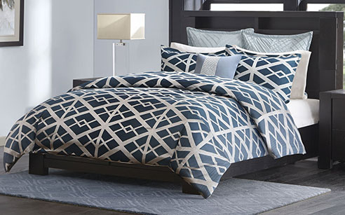 Kenmare Blue by Metropolitan Home adds a touch of modern geometric to a jacquard ombre. Unique and stylish, the Kenmare Blue strikes the ideal balance of pattern and color. Kenmare is available in comforter sets and duvet cover sets . The comforter sets are offered in Queen and King sizes which include comforter, shams. The duvet cover sets, in sizes Queen and King, include duvet cover, pillow shams. Decorative cushion and euro shams are offered to complete your design. Kenmare is also available in Taupe. Machine washable following manufacturers directions.
