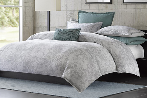 Marble by Metropolitan Home introduces an unexpected element of one of natures most beautiful creations as a bedding collection. The cotton sateen of the Marble has been printed with an overall pattern showcasing the intricate style of natural stone. Marble is available as duvet cover sets in Queen and King size, comforter sets in Queen and King, euro shams and decorative cushions. The accenting blue of the euro shams and decorative oblong cushion add the perfect touch of color. Bedding can be machine washed following manufacturers directions.