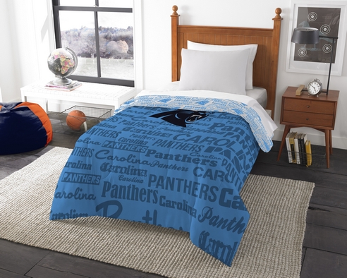 Carolina Panthers Anthem Comforter by The Northwest Company Features a large Panthers Logo atop the teams colors. The Carolina Panthers Anthem Comforter is availavble in Twin and Full/Queen sizes is 100% Polyester and machine washable.