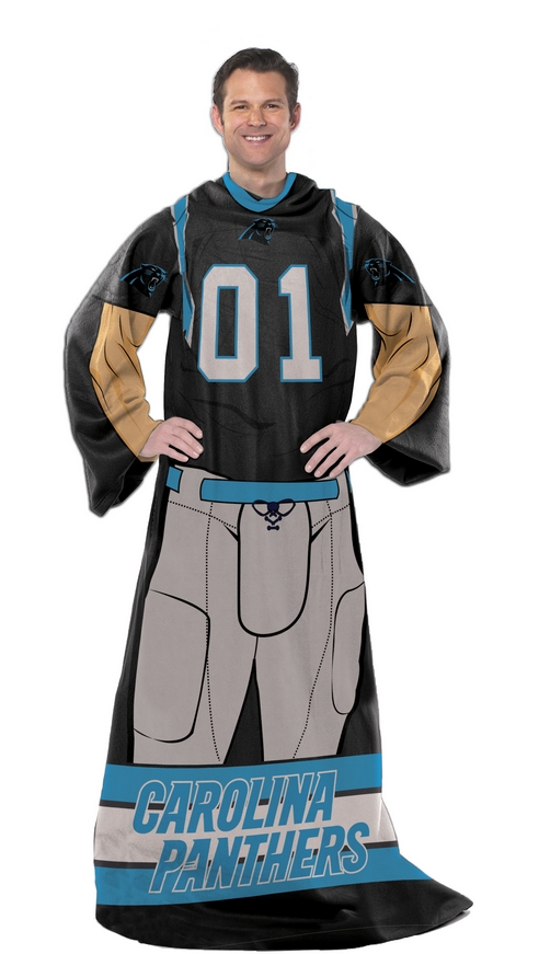 Carolina Panthers Uniform Throw by The Northwest Company lets you dress for the game even if you are just bench warming. This Fleece throw has wide sleeves for comfort to allow your hands to move and keep your upper body warm and cozy. Perfect for indoors or outdoors the Carolina Panthers Uniform Throw is machine washable and 100 percent polyester.